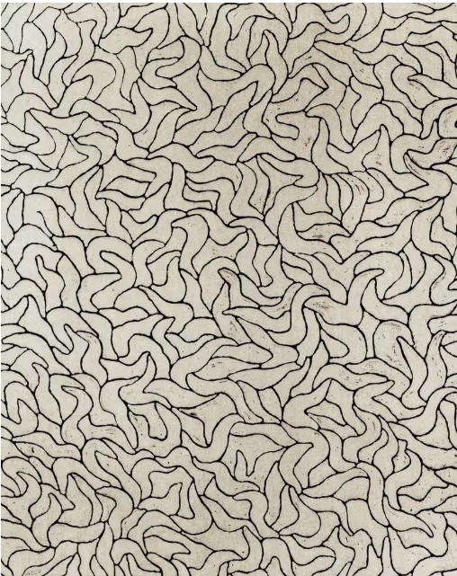 Je me rends compte que mon carnet à idées doit posséder plusieurs caractéristiques, une couverture rigide pour le confort de prises de notes, un format assez large pour l’espace, et j’ai ce qu’il faut, mais qu’est-ce que c’est, noter ? rapide, allusif, entre-deux, évocateur, peut-être pas assez, et peut-être que j’aurais besoin d’imprimer des images pour les agrafer au carnet, histoire de ne pas perdre de vue ce que j’avais pensé sans l’approfondir le temps d’une seconde. C’est très banal ce que je raconte, c’est la banalité de l’agir, avec une forme de petite besogne qui l’accompagne, comme éponger un mur ou laver le sol. J’ai lu un jour un passage dans un livre qui m’avait enchantée, la description du lavage d’un carrelage, arabesques, virgules d’eau qui sèchent, mouvement pendulaires ou circulaires, surfaces moirées, pans satinés qui devenaient mats, ça m’avait enchantée, mais quand j’ai voulu retrouver plus tard ce passage dans le livre, impossible. J’avais dû le fantasmer à partir d’une seule phrase ou d’un mot. J’avais sûrement étoffé (parce que j’en avais besoin, mon cerveau l’appelait) ce qui ne correspondait qu’à un grain de rien, minuscule, en une plage de temps, temps étalé dans le livre, ce qui me fait penser à Bruits d’Anne Savelli, où le temps est présent comme une grille, comme des griffes, une façon de s’accrocher, un treillage, mais usé (parce que le temps), un grillage troué ou aux mailles tordues, le temps est sous Bruits comme une armature de fil de fer sous un bonhomme carnaval à faire brûler, c’est-à-dire que sans lui, sans le temps, on n’est rien, on ne fait rien (c’est banal), mais Bruits montre ce temps comme rarement je l’ai vu dans un livre, comme ces tuyaux de Beaubourg à l’extérieur de sa façade, très vite l’esprit l’intègre, et très très vite l’esprit remercie celui/celle qui a fait cette prouesse de montrer un morceau du squelette sous la chair dans un mouvement qui enveloppe, répare, emmène. Je vais continuer de lire Bruits avec gratitude. J’ai fini un tissage, surtout pour mettre au point une technique qui soit assez répétitive sans l’être. Je note "la répétition" dans mon carnet, je note "l’accumulation" qui est proche. Je note les vaguelettes répétitives de River Wave et Cloud Considering de Kusama (je ne suis pas touchée par ses ronds pop colorés très nets, j’aime mieux lorsqu’elle s’approche de textures vivantes, organismes, cellules).