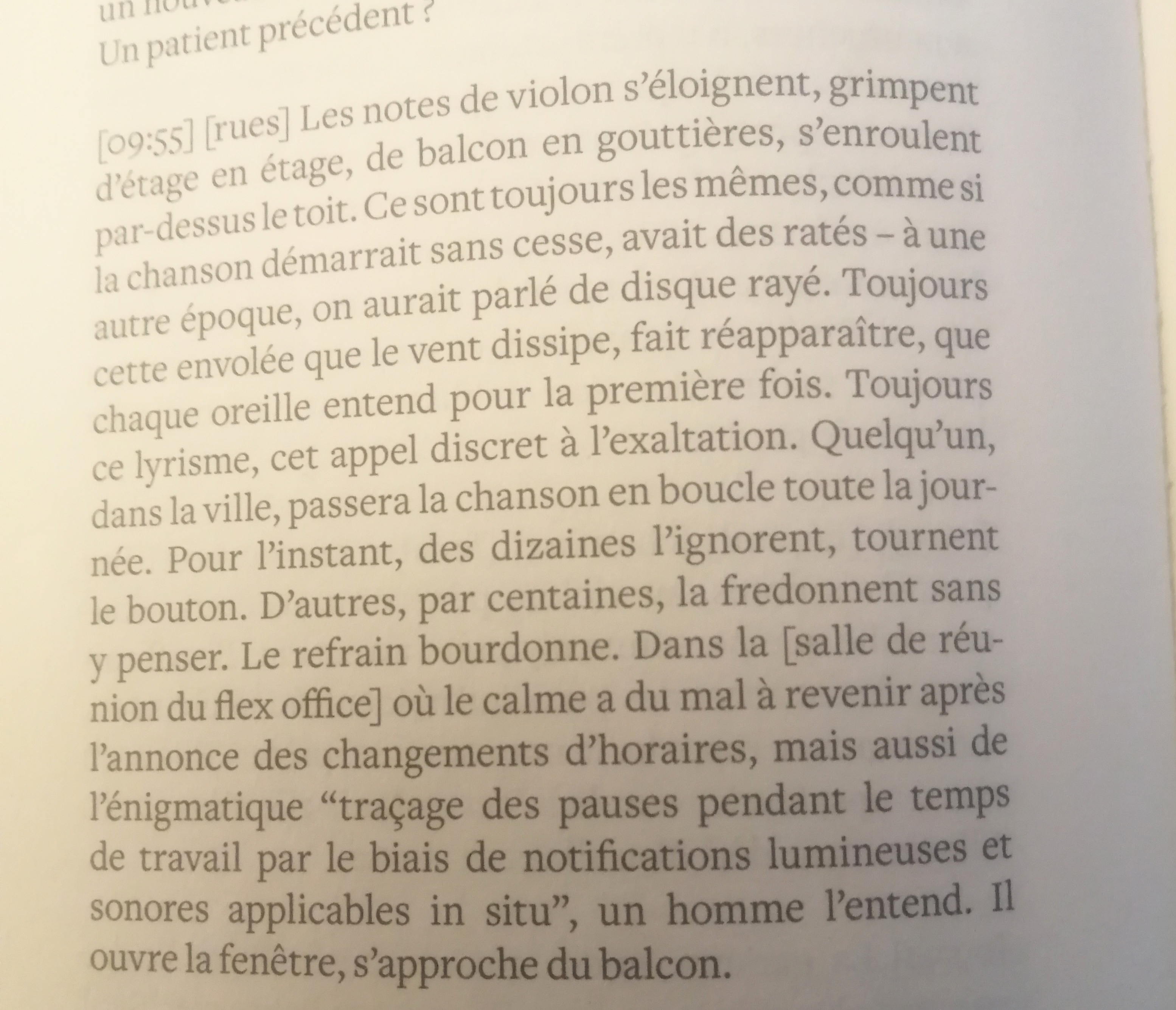 voilà, il y aurait la terre, ses racines, les humains et les diverses techniques pour l’habiter, bâtiments, voitures, panneaux, bitumes, magasins, le ciel, ses nuages et les environs, et ça ne s’arrêterait pas là, même si on pensait avoir tout dit, tout décrit, le sol, les gens, le ciel, il y aurait, en plus du monde inconnu sous la mer et du monde éloigné des forêts et des plantes, il y aurait les sons comme des entités en cohésion, formant un espace, presque autonome, à la fois fantasmagorique et très réel, vivant, des preuves vivantes du vivant — je pense à ce poème très court de Supervielle (Quand nul ne la regarde la mer n’est plus la mer, elle est ce que nous sommes lorsque nul ne nous voit), on se doute bien que la mer est un monde en soi, un monde qui existe sans nous : les bruits aussi sont un monde en soi, un monde qui s’échappe de nous, comme la fumée au-dessus d’une casserole, mais cette fumée ne s’évapore pas, elle s’infiltre et nous transforme autant qu’on la transforme