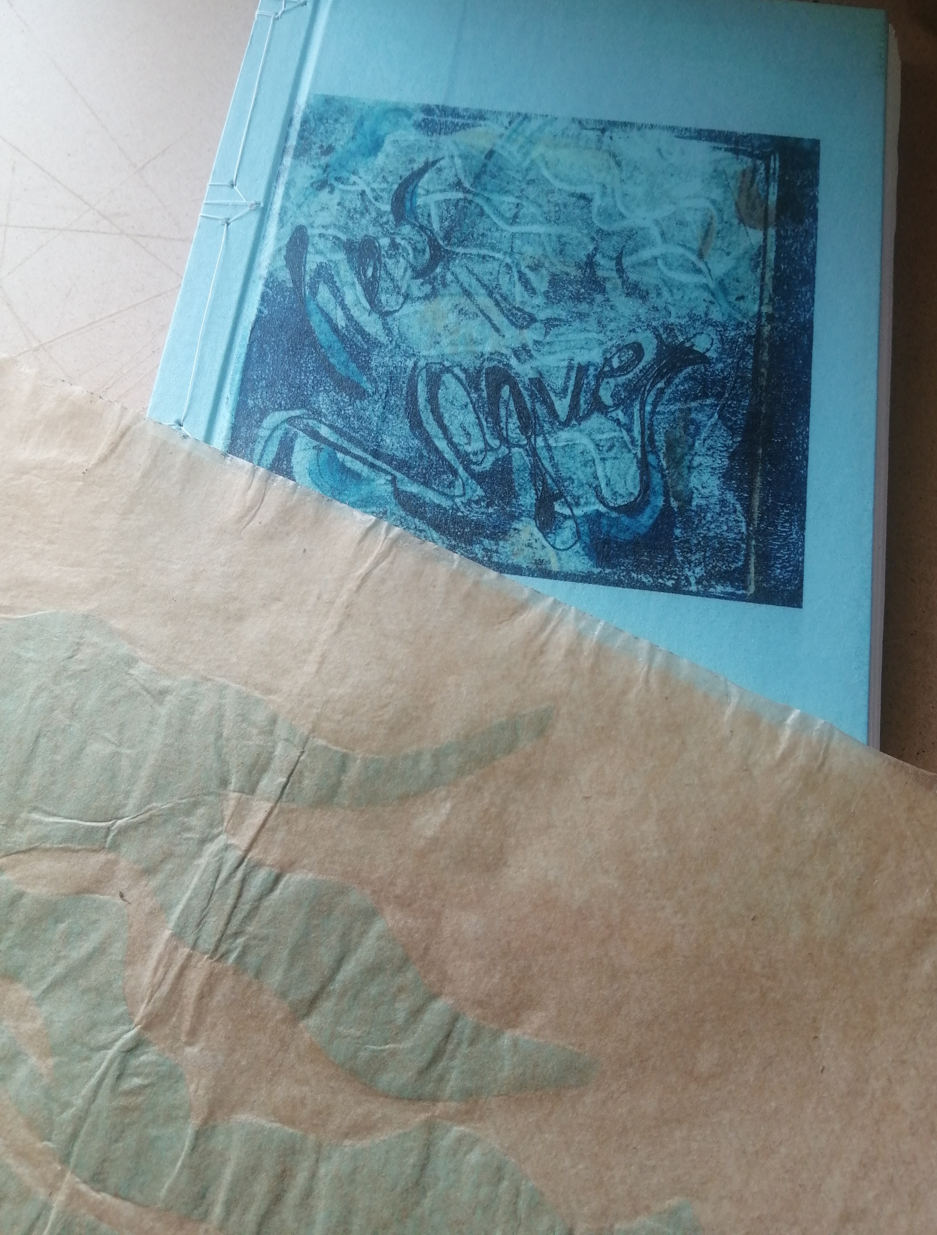 Je crois que je vais devoir faire une croix sur la reliure japonaise en w (ce block note est devenu un tunnel qui fore la fabrique du livre-Vagues, c’est ironique, parce mon problème c’est forer justement des trous bien nets dans une épaisseur de 3 cm de papier et cartons). Je peux essayer de récupérer une dremel chez un membre de ma famille, mais c’est une option incertaine, j’ai bien peur, vu la tête de la possédante de l’outil et sa moue, que les trous soient trop gros pour la structure. Et ce qui me gêne aussi, c’est l’obligation d’un matériel précis, qu’on ne peut pas se procurer aussi facilement qu’une fourchette ou un peigne, et comme le do it yourself fait partie du tout, c’est comme une petite trahison, ou un rétrécissement vers un groupe d’initié·es. La vraie nouvelle, après ce prototype 2, c’est ma certitude de choisir de coudre la reliure. Hier matin, le silence, et uniquement le bruit de l’aiguille, le frottement du fil sur le papier, je veux ça. Cette sorte de méditation qui n’a pas pour but de méditer. J’aime ce qui se créé par la bande, ce qui arrive sans qu’on le désire. Je n’ai pas désiré ce moment intense de calme profond, et il est venu. Pour ce prototype 3 je cherche une couverture souple. J’ai une ou deux idées, notamment une à partir de papier cuisson (c’est bien vulgaire comme matériau, j’adore). Une fois encollé sur du papier ou du tissu, il devient comme de la peau, et comme il est légèrement translucide on peut inclure des formes dessous. L’encoller n’est pas simple, car il roule et il plisse, mais une fois sec je peux peut-être le repasser. J’aime faire des actes terre à terre dans un autre objectif que celui qui semble prévu ou prévisible. Le prévisible en ce moment est effrayant et anxiogène. Plus je vieillis plus je suis en colère. Je radote, mais ce continent de plastiques qui dérivent, il faudrait bien en faire quelque chose, par exemple y mettre tous les malfaisants pour qu’ils fassent leurs petits immondices dessus sans nous gêner, qu’ils se fassent leurs guerres de conquête de bouteilles de soda craquelées sans abîmer rien ni personne.