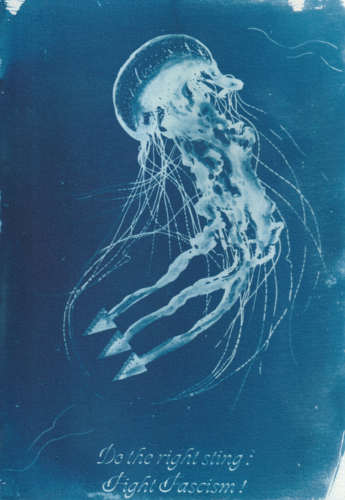Je me suis envoyé des mails cette nuit, pour ne pas oublier, mais je n’ai pas besoin de les lire ce matin, je n’ai pas oublié (c’est ce qui est ironique, combien de fois pendant la nuit, un réveil diffus et l’idée, la bonne idée, l’idée si juste, excellente, cohérente, c’est tellement évident, pas besoin de la noter, du sommeil par-dessus et le lendemain plus rien, l’idée a, pof, disparu). Maintenant, je les note la nuit, elles sont coincées, et je n’ai même pas besoin d’ouvrir le mail, écrire l’idée la nuit a suffi pour l’épingler. Un livre mien (encore que "mien", ça se discute) va paraître début 2026, MW, et j’ai été très occupée par sa mise en page ces derniers jours (et par des idées épinglées la nuit). J’avais l’impression de ne plus pouvoir y ajouter une phrase, mais au moment de trouver une façon de le présenter, c’est comme tout, définir quelque chose lui donne plus d’existence, plus de trame, j’aurais besoin de quelques idées pour l’étoffer, pour qu’il corresponde mieux à la définition que j’en fais. C’est toujours singulier la façon dont on voit les choses. Par exemple, je montre à H le cyanotype d’une méduse antifasciste, avec ses tentacules qui se transforment en trois flèches (symbole de triple opposition au nazisme, au stalinisme et au conservatisme réactionnaire). Mais H ne voit pas ce que je vois. La pâleur du blanc, la forme de crâne de la tête de la méduse, lui renvoient une image de mort, une image fasciste au lieu d’antifasciste. C’est comme ce film de Cronenberg que j’ai regardé hier, eXistenZ, que les critiques interprètent sous un angle philosophique complexe avec des références pointues, alors que je n’y vois qu’un nanard d’idées reçues (le virtuel dans le virtuel sous une couche de virtuel imbriqué dans le virtuel façon poupées gigogne et oh mon dieu, nous perdons de vue le réel "réveillez-vous pauvres fous" à base d’effets spéciaux qui sentent la feuille de chou-fleur mâchouillée). eXistenZ me donne envie de revoir Matrix (que je trouve bien plus finaud, plus profond et plus inventif). C’est perturbant parce que Jean-Baptiste Thoret, que j’aime écouter, porte au plus haut le cinéma de Cronenberg. Le dernier film de Thoret, je ne l’ai pas vu, mais je l’ai tellement écouté en parler que des images se sont formées dans mon esprit. Une ville sous la ville, l’humanité dessus, l’humanité dessous, les gagnants, les perdants, le casino qui réunit le tout, symbolique. La part de jeu de roulette dans la vie est énorme, la part de méduses aussi, de quelques bords qu’elles soient. On sait si peu de choses, sans compter le reste, qu’on imagine. MW porte un peu de ça, de l’existence, sans X et sans Z majuscules, interprétée et réinterprétée. J’en suis toujours à me demander "qu’est-ce que je garde, et si je le peux, qu’est-ce que j’ajoute dans la marge".