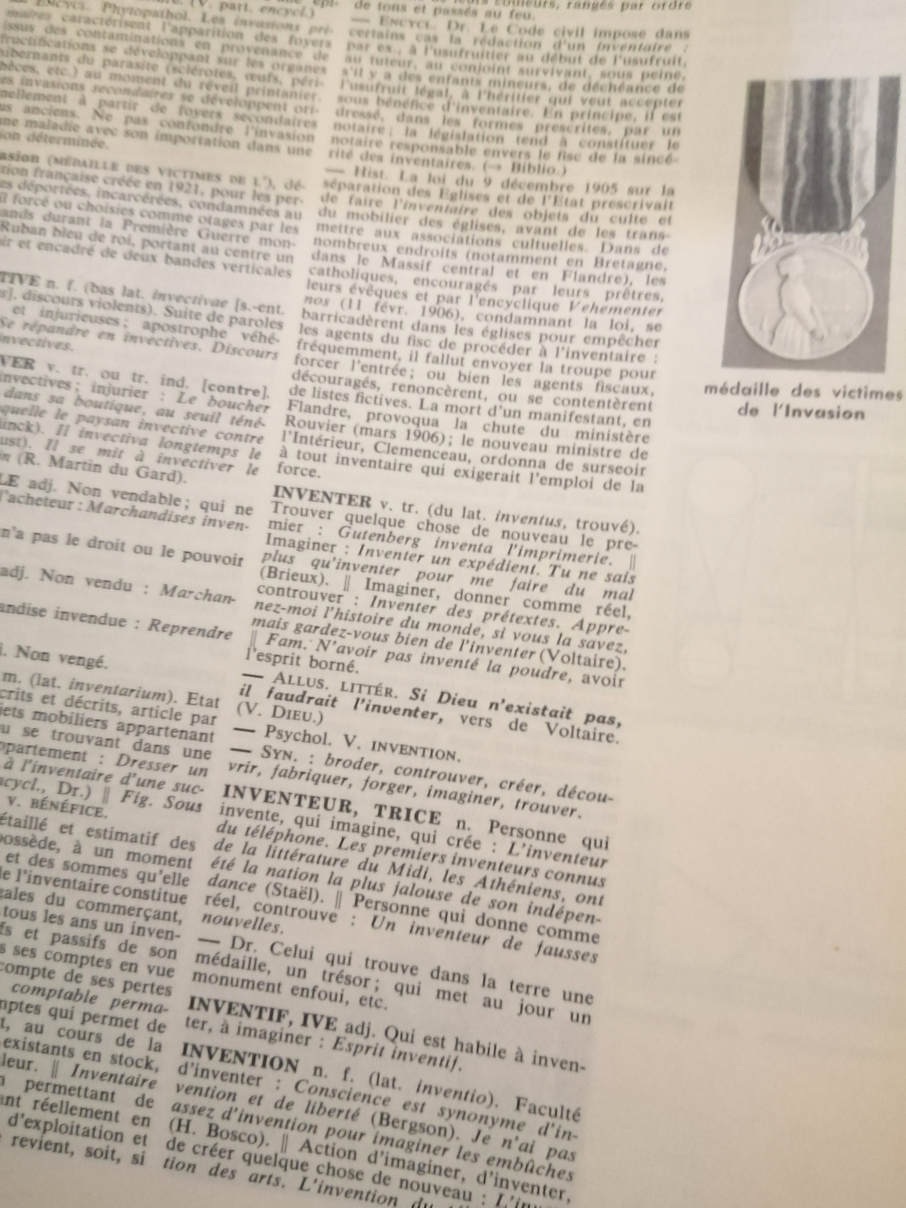 Hier il y a eu les scellés, on ne les met pas partout sur le cercueil, juste sur la vis du haut et celle du bas, le jeune homme dont je ne sais pas le nom a fait fondre un bâton de cire rouge, puis a apposé le sceau en pressant fermement. Un autre s’est incliné, ce sont deux petits gestes à retenir avec les moyens du bord, sans exhaustivité parce qu’on ne voit que ce qui dépasse, que ce qui flotte à la surface. L’avant veille, D a collé des morceaux de faïence en les plaçant de façon à former un cœur. Là aussi, on ne voit que ce qui dépasse, que ce qui a flotté et a été brassé de mer et de sable, ces fragments d’assiettes de porcelaine ou de bouts de carrelage éclatés, sans savoir qui a lavé ces assiettes et y a mangé, ni qui a marché dessus ou épongé quel tour d’évier ou quel seuil. J’ai ramené chez moi un gros volume, le volume 6 du Grand Larousse encyclopédique, numéro 6 comme je ne suis pas un numéro de PMG qui donna sa vraie date de naissance au personnage du Prisoner. En l’ouvrant au hasard, je tombe sur la photo d’une médaille, et sa légende, "médaille des victimes de l’invasion", invasion avec un i majuscule car il semble que cela concerne largement l’humanité. En dessous, il y a le verbe Inventer, sa définition et des citations. "Apprenez-moi l’histoire du monde, si vous la savez, mais gardez-vous bien de l’inventer (Voltaire)." Pauvre, pauvre, qui croit démêler les idées qu’on avale et celles qu’on crache. Plus bas on lit en exemple "Un inventeur de fausses nouvelles" et sur l’autre page sont dessinés des messieurs en bicorne, jugés sérieux. Gravures, sceaux, et, sur le mur, un reflet de lumière, en forme de plume, en forme de résumé.