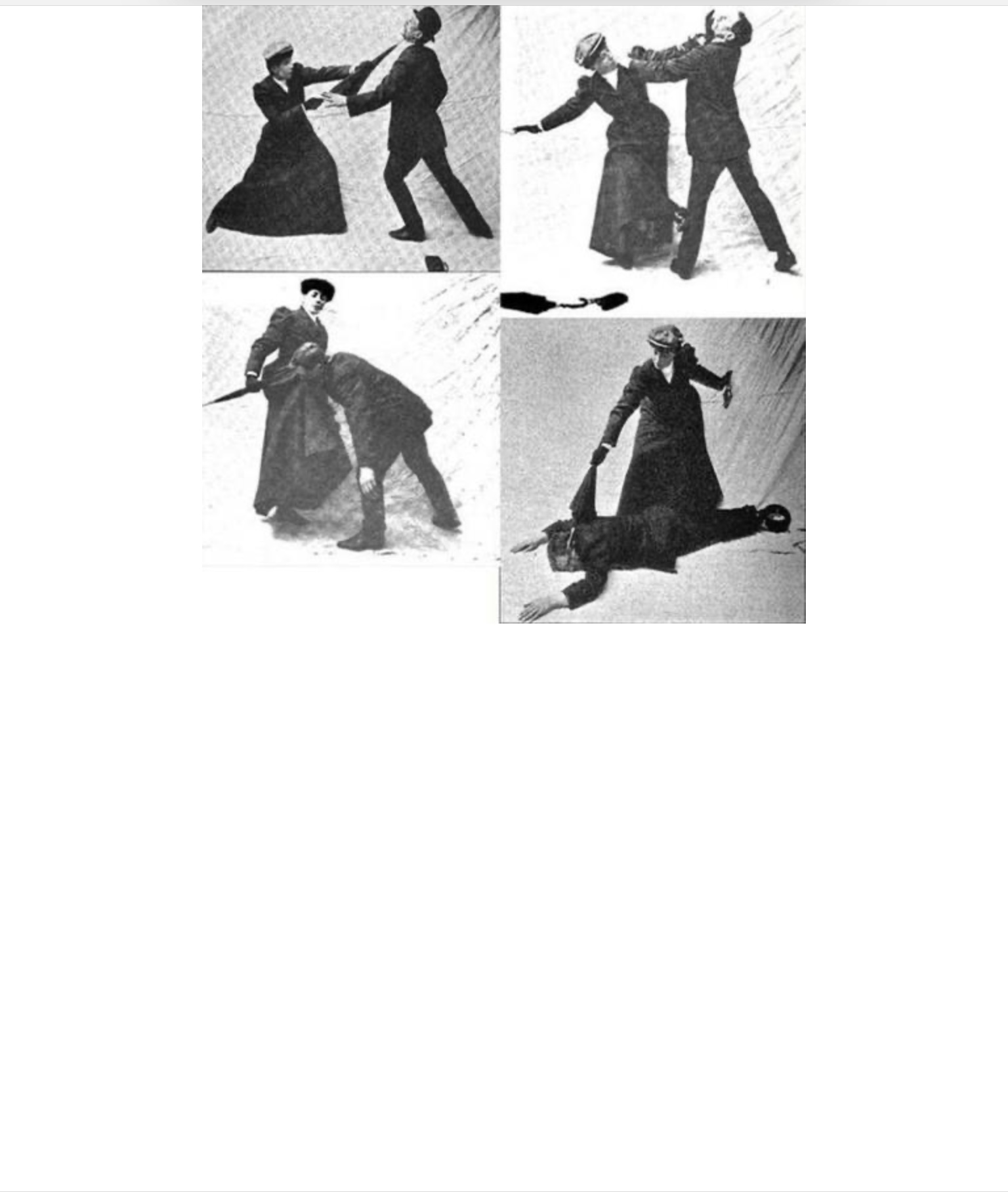 "Edith Garrud devient une figure majeure du WSPU, et ouvre, à la fin de l’année 1909, le Suffragettes Self-Defense Club dans le quartier de Kensington à Londres, dans un lieu où sont dispensés des cours de peinture, de sculpture et de chant et où les ateliers d’autodéfense se déroulent tous les mardis et jeudis soir. L’autodéfense devient effectivement un ’art total’, en raison de sa panoplie de techniques martiales pragmatiques et efficaces, mais surtout en raison de son aptitude à créer de nouvelles pratiques de soi qui sont autant de transformations politiques, corporelles, intimes. En libérant les corps des vêtements qui entravent les gestes, en déployant les mouvements, en détournant, dévoyant l’usage d’objets familiers (parapluie, épingle, broche, manteau, talons), en ravivant des muscles, en exerçant un corps qui habite, occupe la rue, se déplace, s’équilibre, l’autodéfense féministe instaure un autre rapport au monde, une autre façon d’être. Ainsi, en apprenant à se défendre, les militantes créent, modifient, leur schéma corporel propre – qui devient alors en acte le creuset d’un processus de conscientisation politique. [...] Les stratégies développées mêlent techniques de combat rapproché au corps à corps (parades, clefs de bras, utilisation de la force d’inertie de l’adversaire, etc.), contre les policiers, les militants ou même les badauds hostiles à la cause des femmes, et techniques de ruse, qui exploitent les préjugés sexistes selon lesquelles les femmes ne peuvent se défendre. Ces techniques jouent donc sur l’effet de surprise, de stupéfaction sociale et sur la désorientation d’un adversaire qui, en raison même de ses préjugés, n’est pas ’sur ses gardes’ (couper les bretelles pour que les policiers soient contraints de retenir leur pantalon, aveugler la police en ouvrant une armée de parapluies, attaquer les chevaux lors de charges de la police montée, etc.)."