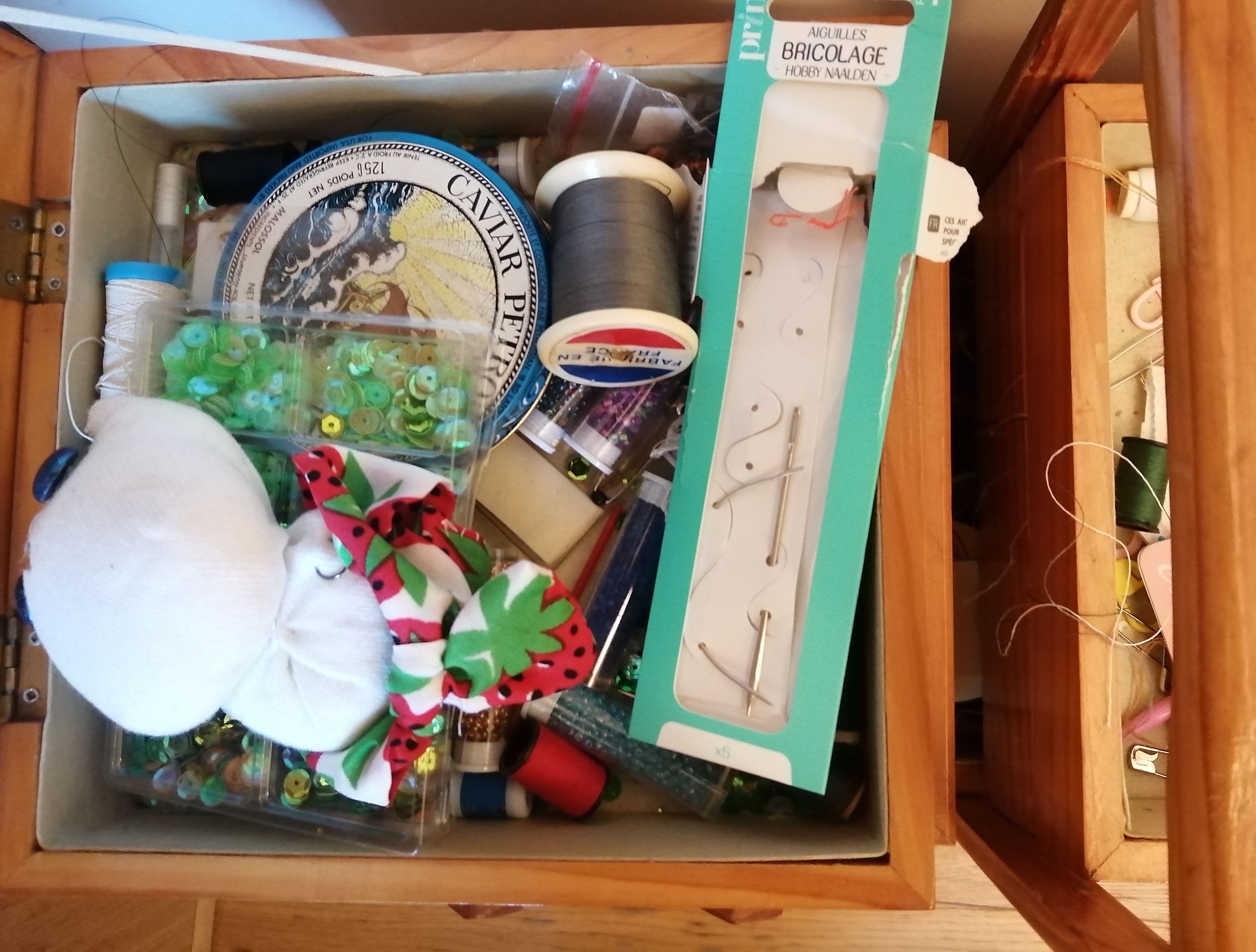 (ma boîte à couture me vient de ma mère, le petit chat pour piquer les aiguilles de ma fille, et la boîte de caviar qui sert à ranger les épingles a été gagnée à un concours quand j’étais petite, on s’est assis autour de la table en grande cérémonie, chacun chacune notre cuillère, la boîte posée au centre sur le dessous de plat en forme de sanglier, mon père a ouvert cette boîte méticuleusement et on s’est servi en même temps, comme de la nage synchronisée, et on se regardait les uns les autres, savourer, nos mimiques, mon père a dit "ah ! quand même...", c’est donc la boîte d’un événement, un événement en boîte, mis en boîte dans une boîte à réparer des trous et lier des trucs ensemble)