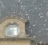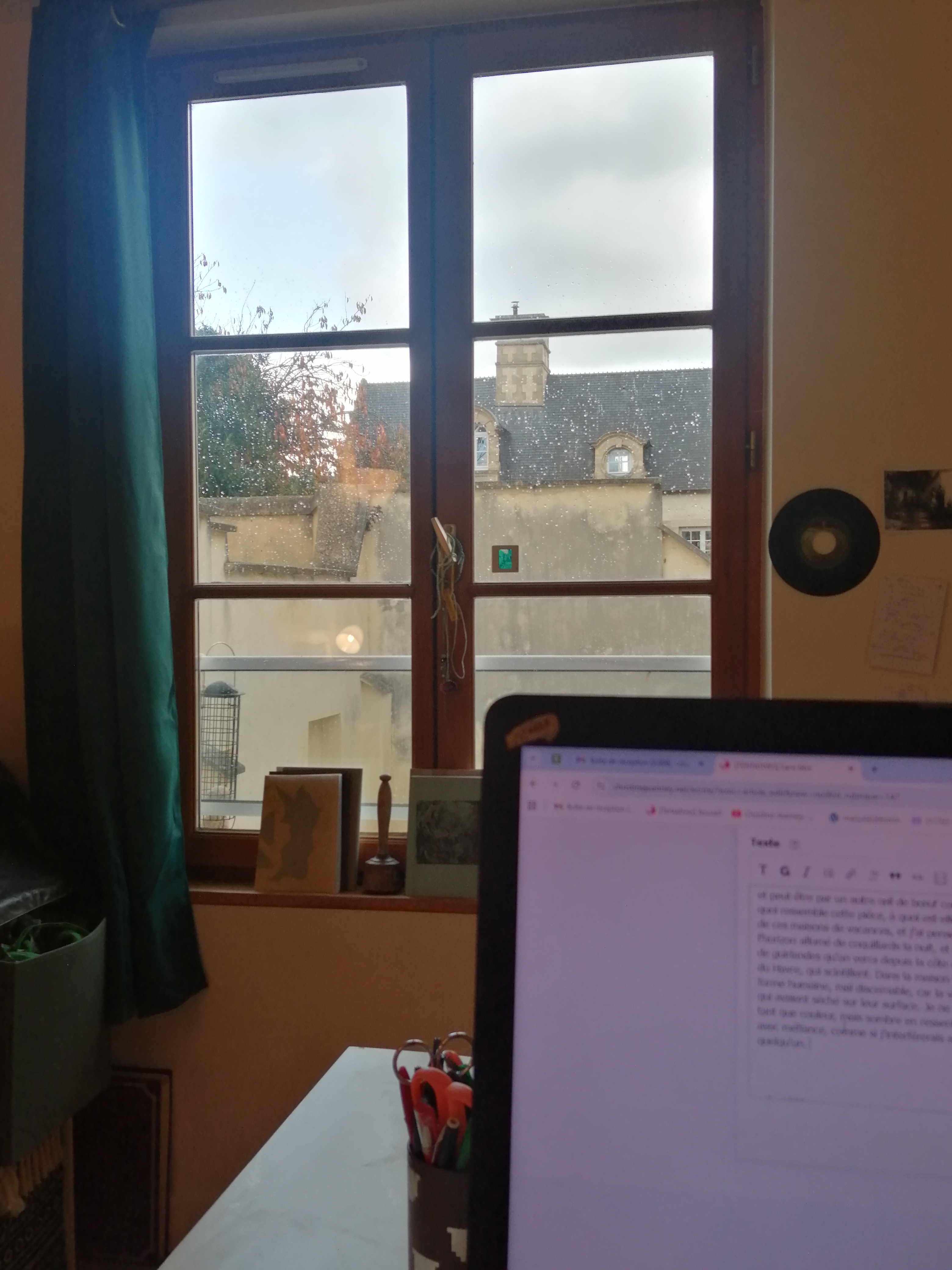 Déplacement de meubles, de matériel, je réorganise mon quotidien, j’ai maintenant une fenêtre face à mon bureau, et je viens d’installer un point graines supplémentaire derrière la vitre pour les oiseaux, eux aussi sont invités à modifier leurs habitudes. C’est une question sérieuse dit quelqu’un, c’est légitime dit quelqu’un d’autre, et une troisième voix demande des réponses sérieuses aux questions sérieuses. Une fois l’agencement de l’espace de travail trouvé, je dois aller vers le plus précis, plus petit, plus méticuleux, explorer chaque boite, tiroir, soupeser chaque morceau de tissu, chaque collage sur carton, chaque brouillon imprimé, avec la question de le jeter/garder et si-oui-quoi-en-faire. Il y a des statistiques sur le temps de sommeil dans une vie, le nombre de douches converties en jours, pareil pour les repas, et quelle proportion de temps passé à s’habiller, à cuisiner, à attendre, à lire, etc., je ne sais pas combien de jours/mois/années je passe à me poser des questions (sérieuses) en quête de réponses (sérieuses), par exemple je vois très clairement, si je regarde droit devant moi par la fenêtre nouvellement disponible, un œil de bœuf au troisième étage d’un bâtiment, œil de bœuf traversant, c’est-à-dire qu’on voit la couleur du ciel derrière lui, peut-être par un autre œil de bœuf construit en symétrie, et je n’ai aucune idée de ce que je vois, à quoi ressemble cette pièce, à quoi est-elle destinée, qui l’habite. Avant-hier, longeant la mer, il y avait une de ces maisons de vacances, et j’ai pensé celle-ci est très bien aménagée avec ses baies vitrées face à l’horizon allumé de coquillards la nuit, et la plate-forme du chantier pour construire des éoliennes en mer se parera de guirlandes qu’on verra depuis ce salon en décembre. Quand il fera clair, on pourra apercevoir les deux tours blanches du Havre qui scintillent. Dans cette maison très bien placée, très bien vitrée, j’ai vu d’un seul coup au premier étage une forme humaine, mal discernable, car la vitre était floue, sûrement les gouttes de pluie mélangées au sable qui avaient séché à la surface. Je ne sais pas qui j’ai vu. Cette forme avait l’air sombre. Pas sombre en tant que couleur, mais sombre en ressenti. Comme un fantôme déprimé, car inactif peut-être. Je crois qu’il m’a fixée avec méfiance, comme si j’interférerais avec ses pensées graves. C’est un sujet extrêmement complexe dit quelqu’un. Je prends la photo avec l’œil de bœuf pour me souvenir du souvenir.