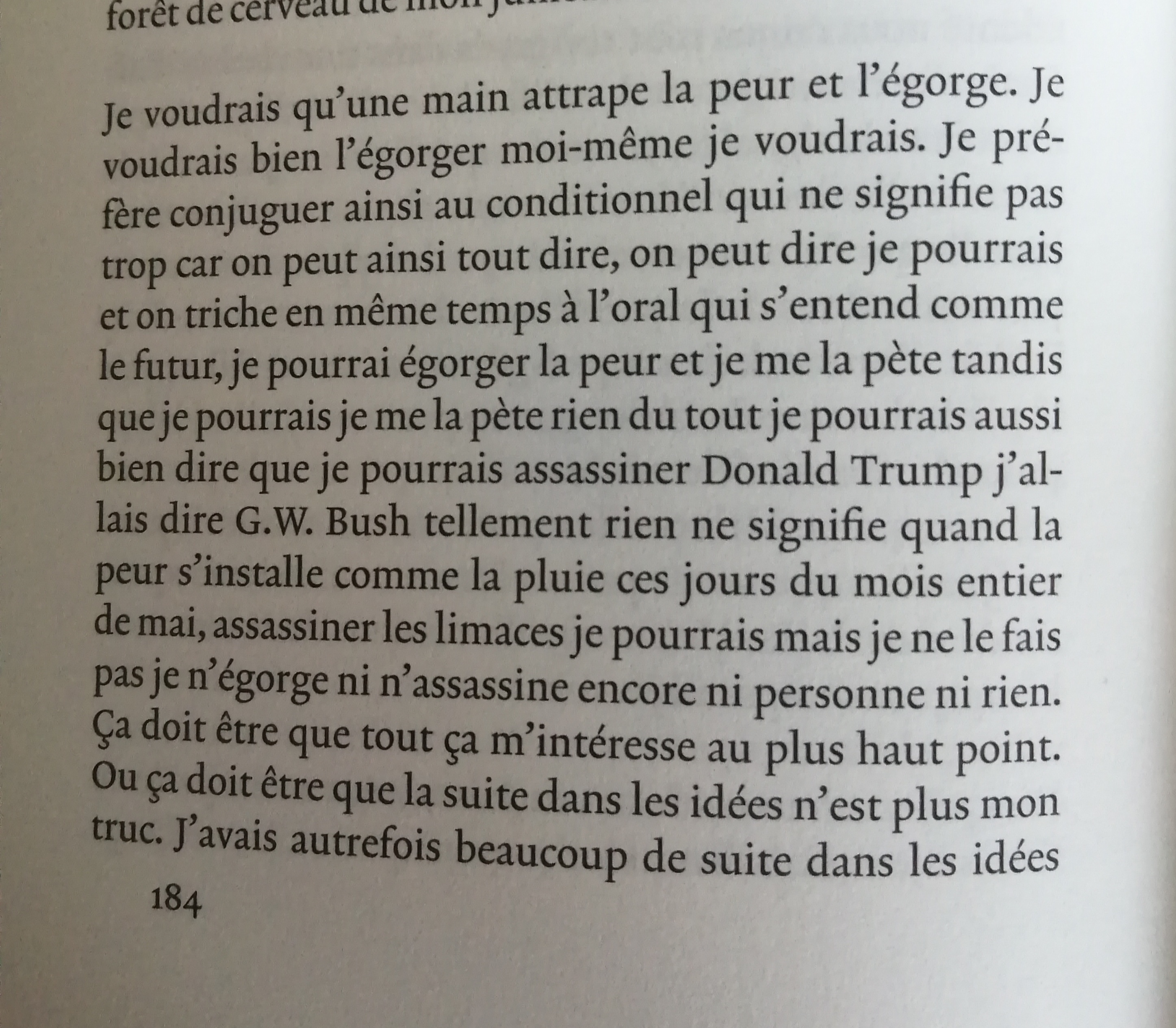 il y a des notes de bas de page qu’on pourrait dire hors sujet si on était boutonné jusqu’au col, il y a des majuscules, des sons, des mots incomplets (les boutonnés jusqu’au col doivent se sentir perdus les pauvres, eux qui tombent en catatonie devant un point médian), il y a quelque chose de révolutionnaire dans tout le monde quelque chose et à tous les étages, celui du soi, celui de l’autre, celui de l’entour, du lieu, du temps, de la place, de la vue, du corps, de l’accès à, et au fond il y a ce que j’appelle poésie, pas au sens usuel, pas une catégorie, pas du mièvre, pas du calme ordonné, mais pas du tout du désordonné non plus, c’est très bien ordonné, par contre ce n’est pas l’ordre tel qu’admis