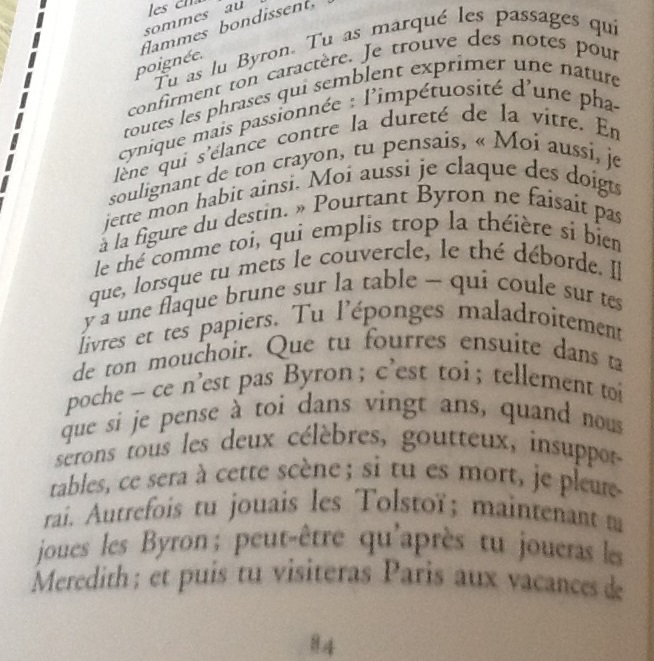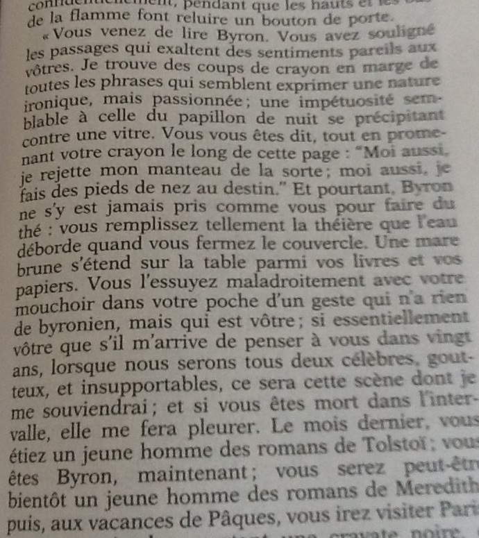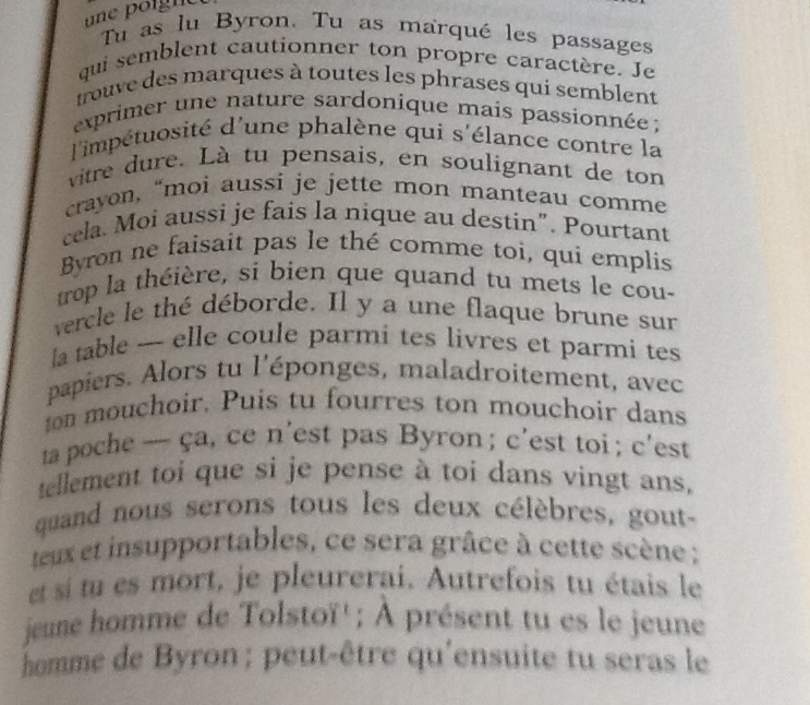 « Tu as lu Byron. Tu as souligné les passages qui te semblaient répondre à ton caractère. J’ai trouvé des coups de crayon sous toutes les phrases qui exprimaient un tempérament sardonique, mais exalté ; une phalène fougueuse lancée contre une vitre dure. En soulignant, tu te disais "Moi aussi, je jette mon manteau de cette façon. Moi aussi, je sais narguer le destin". Mais Byron n’a jamais fait le thé comme toi, remplissant à ce point la théière qu’au moment où tu places le couvercle elle déborde. Il y a une flaque brune sur la table – qui se répand autour des livres, des papiers. Et voilà que tu l’éponges, maladroitement, en te servant de ton mouchoir que tu ranges ensuite dans ta poche – ce n’est pas du Byron ; c’est toi ; c’est tellement toi que lorsque je pense à ce que nous serons tous les deux dans vingt ans, célèbres et cloués par la goutte, insupportables, c’est cette scène que je reverrai : et si tu es mort, je pleurerai. Hier, tu sortais tout droit d’un roman de Tolstoï ; d’un livre de Byron aujourd’hui ; demain, ce sera peut-être du Meredith ; et puis, tu visiteras Paris pendant les vacances de Pâques, tu rentreras, portant la cravate noire d’un Français détestable dont personne n’a jamais entendu parler. Et là, je te lâcherai. »