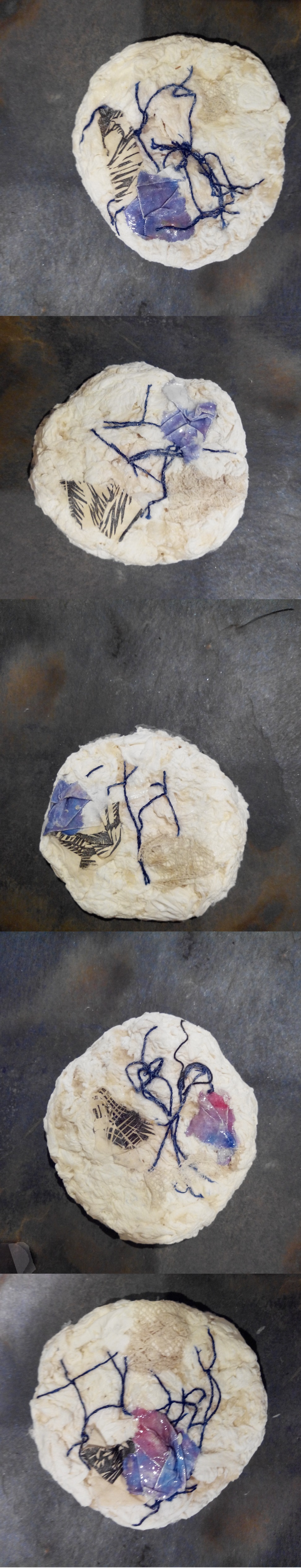 "Au Japon on faire cuire du riz plus d’une heure et on recueille l’eau de cuisson blanche pour s’en servir de colle (la technique des Kanzashi, les fleurs en tissu pour cheveux une fois imbibées deviennent rigides). On peut aussi ajouter à la pâte à papier de la farine, du sel, du plâtre, du détergent, de l’huile. Le mélange obtenu changera en séchant. Il durcira et il s’éclaircira, on ne peut pas vraiment prévoir. Dorsafe veut le modeler en petits disques. Elle ne sait pas encore si elle gardera leur périmètre très lisse, ou si elle laissera le cercle s’effilocher. Elle inclura sur la surface du disque une multitude de choses dont elle n’a pas encore idée. Il faudra que ça vienne de soi-même (commun, collectif et rare), que ce soit facile à trouver (ready made et arte povera) que ça passe à proximité. Un caillou, une plume d’oiseau, du fil. Chaque disque sera une petite cosmogonie différente, porteuse d’un monde spécial, précis et limité, sans importance mais présent. La cour avec le restaurant, la rue passante, l’étage, c’est aussi une sorte de petite cosmogonie pense Dorsafe.")