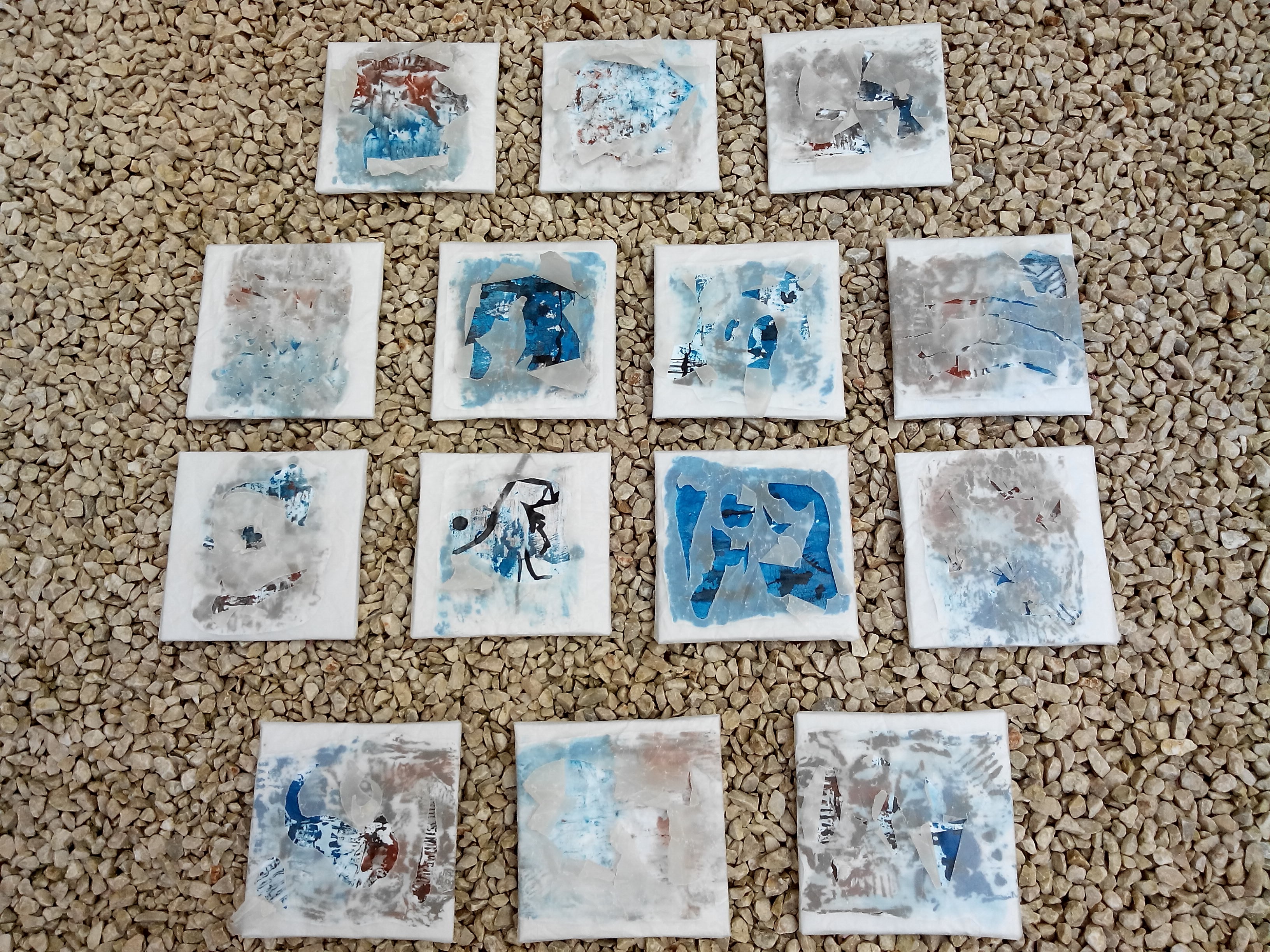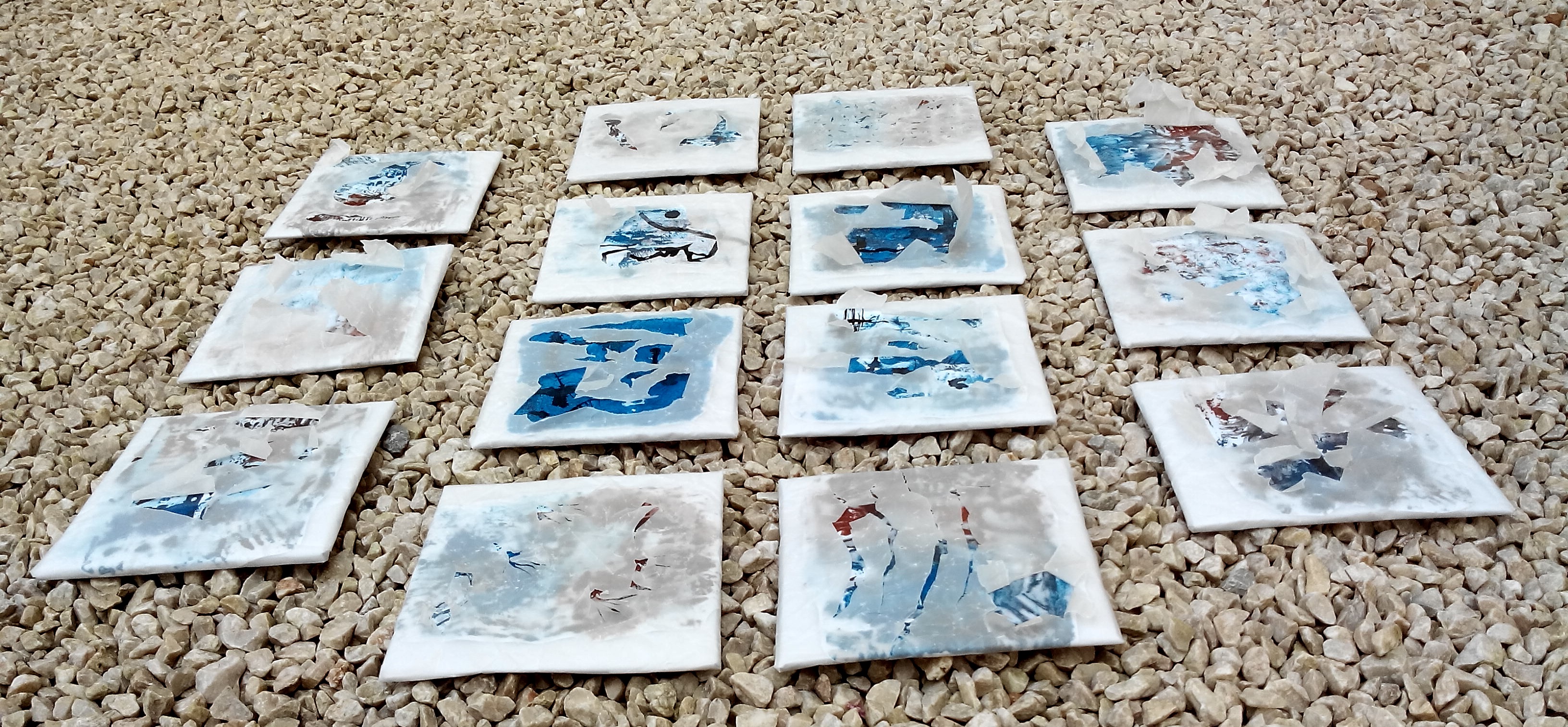 (14 pièces, carton marouflé, papier, gouaches, encre de chine, impression par collagraphie, colle de farine, papier calque)
